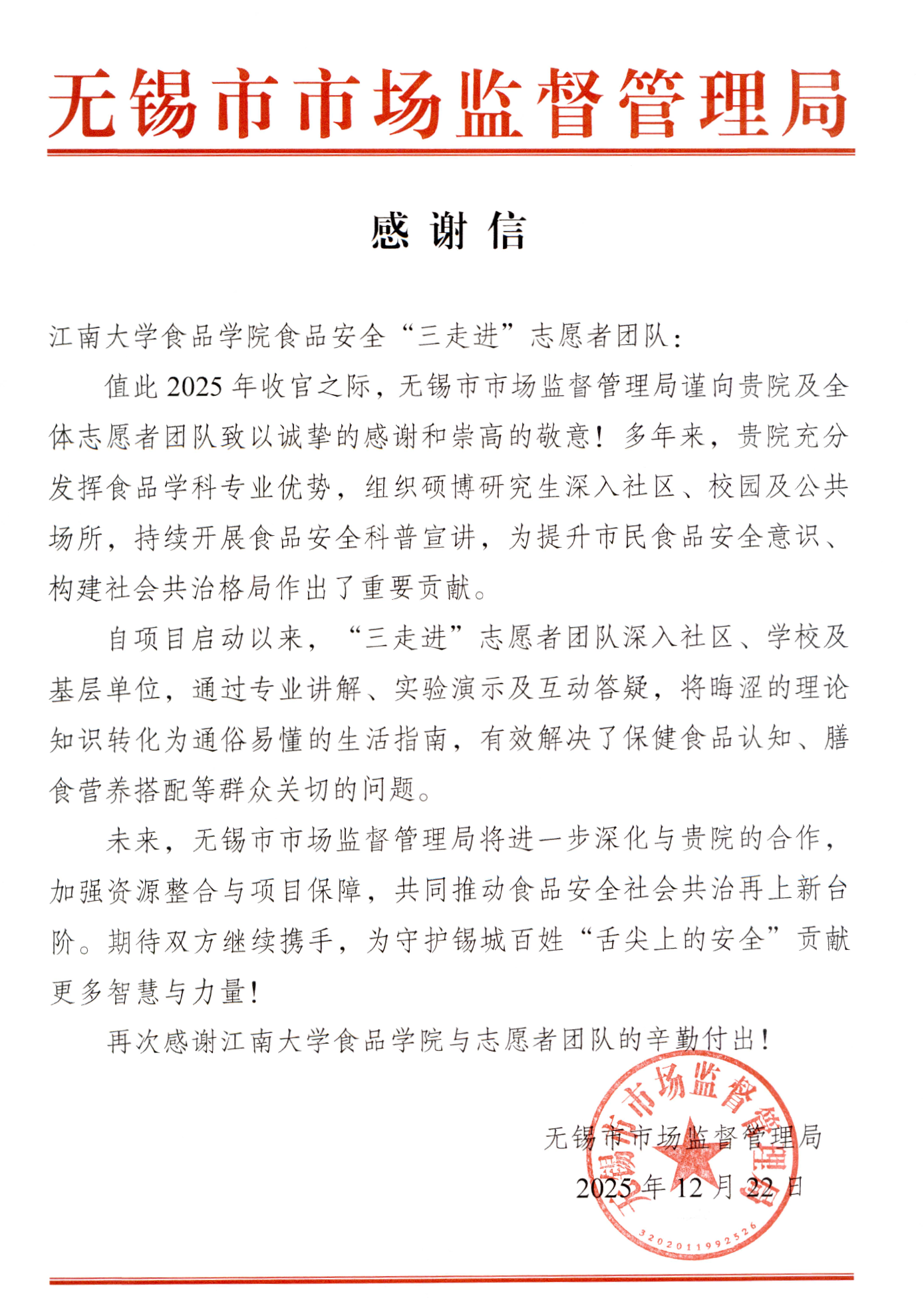 团队与无锡市市场监督管理局长期以来保持着紧密的合作关系。近日,市局特别向学院及全体志愿者团队发来感谢信,对双方在食品安全社会共治方面的协作成果给予充分肯定。感谢信是对我们双方携手服务社会、共建食安防线工作的生动注脚,也为未来的合作注入了更强的信心。展望新征程,希望亚洲色吧